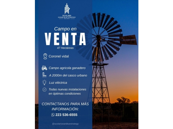 Campo. Se encuentra en la localidad de Coronel Vidal. A escasos 2000 metros del casco urbano. Esta distribuido en 47 hectáreas en una sola parcela, en una hectárea encontramos la casa principal, galpones, un espectacular parque, y una pequeña vivienda para caseros. El campo es de uso agrícola ganadero u otra actividades, posee alambres nuevos en todo el perímetro, molino, tranqueras, todo nuevo en optimas condiciones, la vivienda, los galpones también fueron construidos de cero, listo para empezar a trabajar o descansar como usted prefiera.