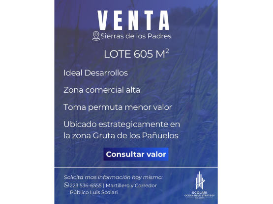 El lote esta ubicado en una zona comercial alta, en la misma se encuentran diferentes comercios de distintos rubros. El mismo tiene un gran potencial de construccion. Ejemplos: Restaurant, Bar, Galeria Comercial, Dormis, Cabañas,Etc.